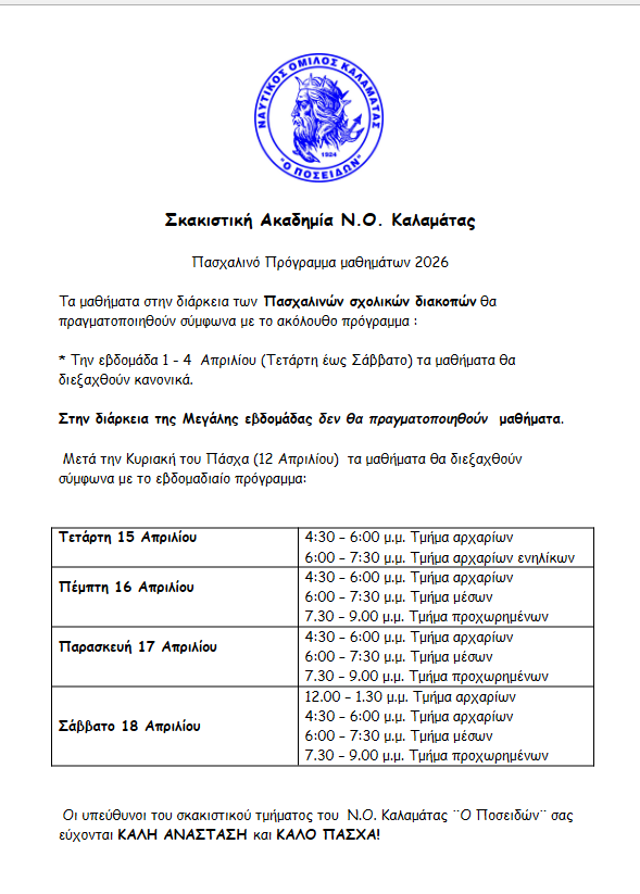 Μία όμορφη και ευοίωνη χρονιά ξεκινά για την Σκακιστική Ακαδημία του Ναυτικού Ομίλου Καλαμάτας.