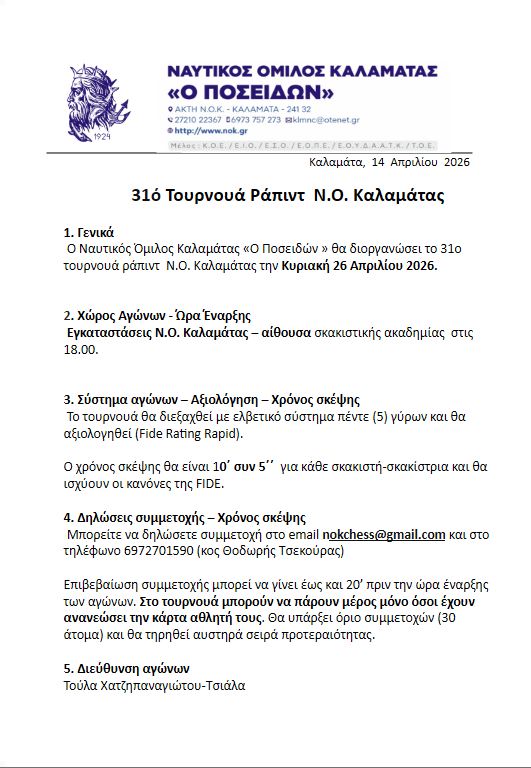 Ξεκίνησαν με επιτυχία τα τρία κλειστά τουρνουά του Σκακιστικού Τμήματος του Ναυτικού Ομίλου Καλαμάτας την Κυριακή 26 Οκτωβρίου στις 17:30.