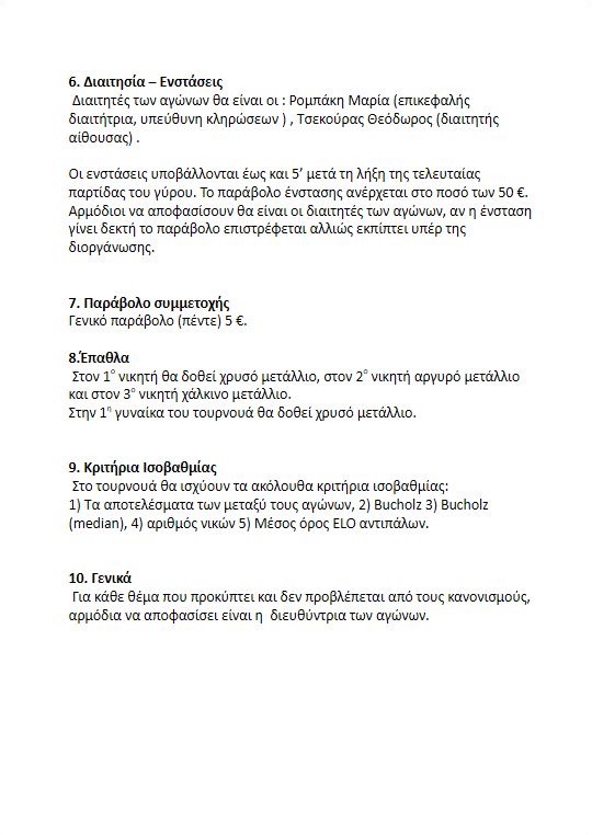 Επίσης τα ευχαρίστησε μέλη της Οργανωτικής Επιτροπής: κα. Βάσω Ποδοχωρίτη, κα. Δώρα Καπερνέκα, κ. Θοδωρή Τσεκούρα, κ. Μανώλη Μουτζούρη και κ. Φίλιππο Παπαδημητρίου – Λεβεντογιάννη. Ιδιαίτερα ευχαρίστησε για την διαιτησία την κα. Μαρία Ρομπάκη (υπεύθυνη κληρώσεων και διαδικτυακής μετάδοσης των αγώνων και υπεύθυνη σχεδίασης των αφισών) και την βοηθό διαιτησίας σκακίστρια κα. Αλειφέρη Κατερίνα.