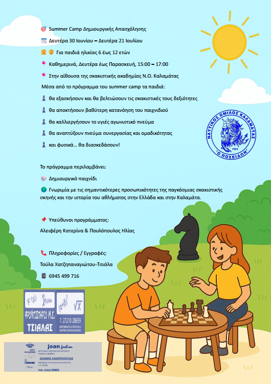 Από Δευτέρα 30/6 έως και Δευτέρα 21/7/2025 για παιδιά 6-12 ετών καθημερινά Δευτέρα έως και Παρασκευή 15:00 – 17:00 στην δροσερή αίθουσα της Σκακιστικής Ακαδημίας του Ναυτικού Ομίλου Καλαμάτας.